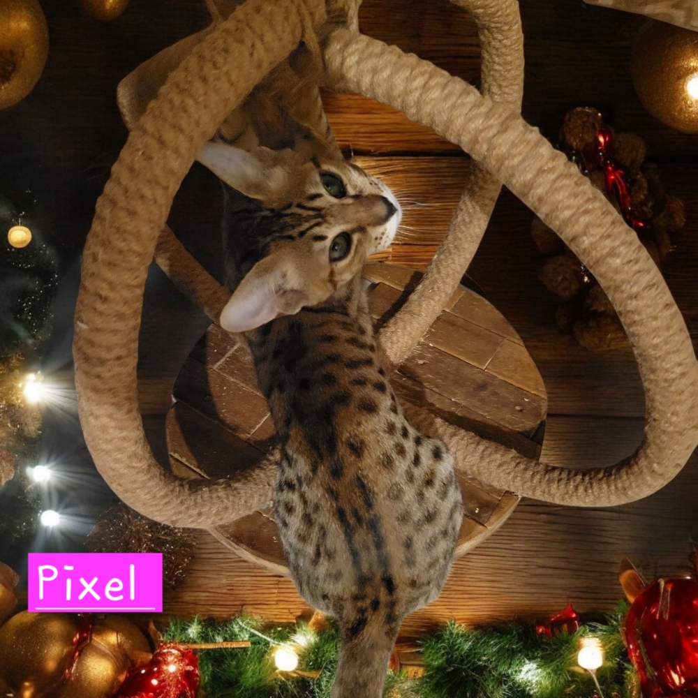 Our kittens are absolutely adorable! Savannahs are known for their exotic appearance and playful personality. With their golden and silver fur and distinctive spots, they truly stand out.
